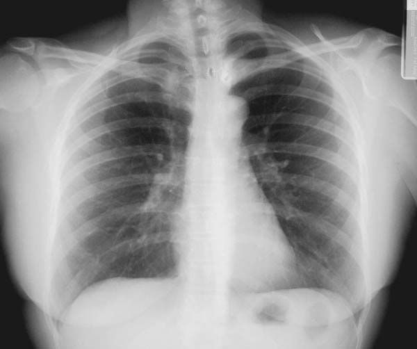 Atras | Indice | Siguiente Comentario placa 2 El extremo de la clavícula izquierda está más cerca de la apófisis espinosa que el de la clavícula derecha. Esto indica que el tronco está rotado, con el hombro izquierdo hacia adelante ( oblicua anterior izquierda). Como se ilustra en el esquema adjunto, con este giro la apófisis espinosa se desvía hacia la izquierda de la línes media, mientras que el extremo de la clavícula izquierda se acerca a la línea media. Los hilos pulmonares, al acercarse ambos a la línea media, se confunden parcialmente con el corazón.