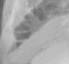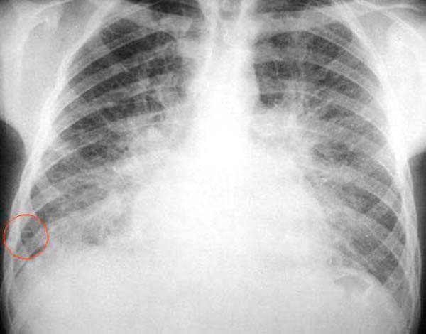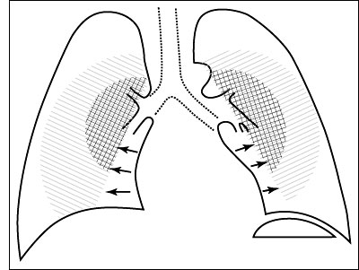 ESQUEMA 21 Comentario placa 21 Es llamativo el aumento de tamaño del corazón y el engrosamiento de la trama vascular y relleno alveolar que irradian simétricamente desde los hilios, lo que sugiere una insuficiencia cardíaca con congestión pulmonar pasiva. En la base de la pared costal derecha se pueden ver una sombras lineales finas (1-2 mm) de menos de 2 cm de largo, paralelas y dispuestas perpendicularmente a la pleura costal denominadas líneas B de Kerley o septales, que son mas perceptibles en la ampliación de la zona (Placa 21-A).
