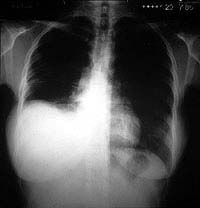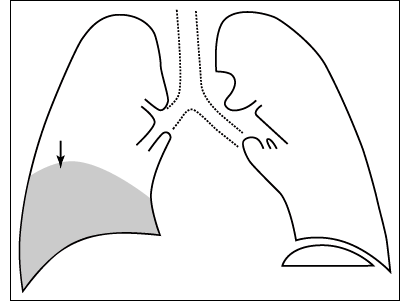 Esquema 44 Comentario placa 44 La primera impresión es que el diafragma derecho se encuentra ascendido. Sin embargo, la historia del paciente y el desplazamiento del vértice de la supuesta cúpula diafragmática hacia la pared lateral del tórax, hicieron sospechar un derrame infrapulmonar. La cúpula del diafragma alcanza su mayor altura a nivel de la linea medioclavicular. Para comprobar esta hipótesis se tomó una radiografía en decúbito lateral con rayo horizontal (placa 45). |