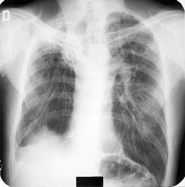 Fibrosis cicatrizalOtra causa de frecuente de opacidades pulmonares son las cicatrices de lesiones pulmonares con acumulación de tejido fibroso, usualmente retráctil. Su carácter residual no es siempre evidente por la sola radiología y suelen ser necesarios considerar el cuadro clínico del paciente, realizar otros exámenes o demostrar la estabilidad de la lesiones en sucesivos controles. Examine la siguiente placa e indique sus alteraciones