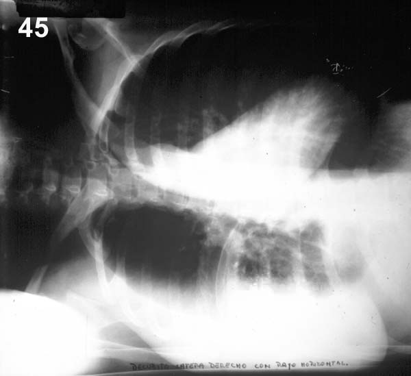 En esta posición, el líquido que estaba acumulado entre pulmón y diafragma se desplaza, por efecto de la fuerza de gravedad, a la parte más baja de la cavidad pleural y se ve como una capa o franja homogénea de más o menos 2 cm de espesor sobre la pared costal derecha. |