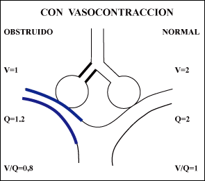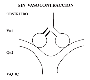IntroducciónLa hipoxemia es el principal factor de riesgo de muerte en los pacientes con EPOC. Consecuentemente, su detección precoz y corrección mediante oxigenoterapia son parte importante del manejo terapéutico de estos pacientes, en conjunto con el tratamiento de las alteraciones fisiopatológicas que causan la hipoxemia. Fisiopatología de la hipoxemiaLa mayoría de los pacientes con EPOC presentan gases en sangre arterial normales o poco alterados durante largo tiempo, debido a la eficacia de los mecanismos compensatorios intrapulmonares. En efecto, las áreas del pulmón que tienen mala ventilación por obstrucción bronquial y enfisema, suelen presentar vasocontricción compensatoria, motivo por el cual la relación V/Q puede mantenerse cerca de lo normal. La Figura 1.1 muestra una zona de pulmón con obstrucción bronquial que hipoventila, por lo cual su relación V/Q está disminuida a 0,5. La Figura 1.2 muestra que si se produce una vasocontracción compensatoria, la relación V/Q sube a 0,8, por lo que los gases arteriales tienden a normalizarse.