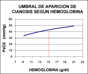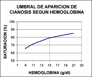 Manifestaciones clínicas de la hipoxemiaLa hipoxemia produce cianosis y varias otras manifestaciones clínicas, la mayor parte de ellas inespecíficas. CianosisLa hemoglobina insaturada es de un color rojo-morado, que da su color característico a la sangre venosa. Cuando su cantidad absoluta en la sangre capilar sobrepasa los 5 g/dl, los tejidos comienzan a adquirir el color violáceo característico de la cianosis, que clínicamente es apreciable en piel y mucosas. Aunque la medición instrumental tiene mayor sensibilidad y objetividad, no siempre está accesible, por lo cual la detección de cianosis es muy útil en clínica, siempre que se tenga presente su génesis fisiopatológica y sus limitaciones. La Hb reducida en los capilares puede aumentar por dos caminos: