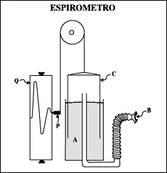 EspirometríaConsiste en la medición de los flujos espiratorios desde CPT hasta Volumen Residual durante una espiración forzada máxima. La prueba se realiza con el paciente de pies o sentado, con o sin una pinza nasal. El operador conecta al paciente con el espirómetro (Figura 3.1) mediante una boquilla y le solicita que respire tranquilamente durante unos pocos ciclos. Luego solicita al paciente que haga una inspiración máxima, seguida inmediatamente de una espiración máxima. Con esta maniobra se obtiene una curva como la que se muestra en la Figura 3.2, en la cual se miden tres índices de uso clínico habitual.