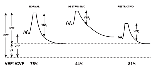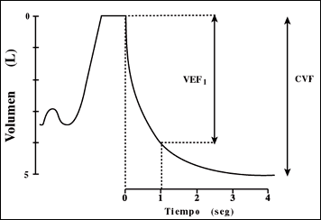 Capacidad Vital Forzada (CVF). Es el máximo volumen de aire que puede espirar un individuo después de una inspiración máxima. Es un indicador del tamaño pulmonar. Por lo tanto, la CVF disminuirá en todas las enfermedades en que exista disminución del volumen pulmonar funcionante (enfermedades restrictivas), por relleno o colapso alveolar, por aumento de la rigidez de las paredes alveolares o por otros mecanismos. Volumen espiratorio forzado del primer segundo (VEF1). Como su nombre lo indica, es el volumen de aire que espira un individuo en el primer segundo de la maniobra. El valor absoluto de VEF1 es dependiente de dos factores: