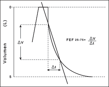 FEF25-75. La Figura 3.4 muestra que el FEF25-75 es la pendiente de la curva espirométrica entre el 25% y el 75% de la CVF. Esta pendiente (que corresponde a volumen/tiempo = flujo) es un índice más sensible que la relación VEF1/CVF en la detección de obstrucción bronquial. Por lo tanto, su disminución bajo valores normales permite afirmar la presencia de pequeños grados de obstrucción, por ejemplo en fumadores con otros índices espirométricos normales.