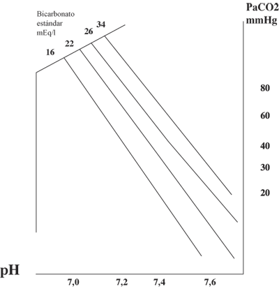12.- La Figura 2 muestra isópletas de bicarbonato estándar, calculadas para cada combinación de PaCO2 y pH.