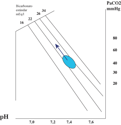 | 14.- La Figura 4 muestra la situación de un individuo previamente sano que desarrolla una acidosis respiratoria aguda. En este caso, la PaCO2 aumenta de 40 a 60 mmHg y el pH baja a 7,26. El bicarbonato estándar se mantiene normal, ya que se calcula suponiendo que la PaCO2 ha vuelto a 40 mmHg.