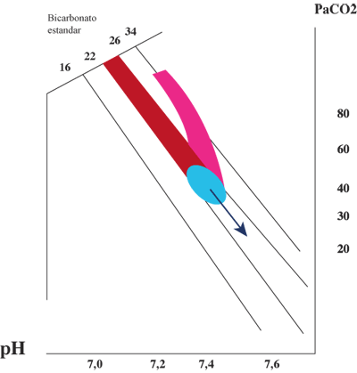 | 18.- La Figura 8 muestra los valores de un individuo previamente normal que hiperventila en forma aguda. Se puede observar que la PaCO2 baja a 25 mmHg, con lo cual el pH sube a 7,53. El bicarbonato estándar no se modifica, ya que no se ha producido compensación renal.