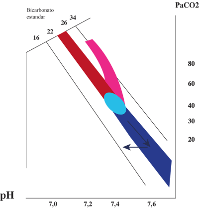 | 20.- La Figura 10 muestra el estado ácido-base del mismo enfermo después de algunas horas. El sujeto ha continuado hiperventilando y como compensación el riñón ha excretado bicarbonato, lo que se refleja en una caída del bicarbonato estándar. El pH se ha normalizado.