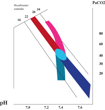 | 21.- La Figura 11 muestra con color verde el área de hipocapnia crónica, compensada. Se puede ver que corresponde a valores con PaCO2 baja, bicarbonato estándar disminuido y pH normal. La normalización del pH refleja que el riñón tiene una excelente capacidad para excretar bicarbonato, lo que permite una compensación completa.